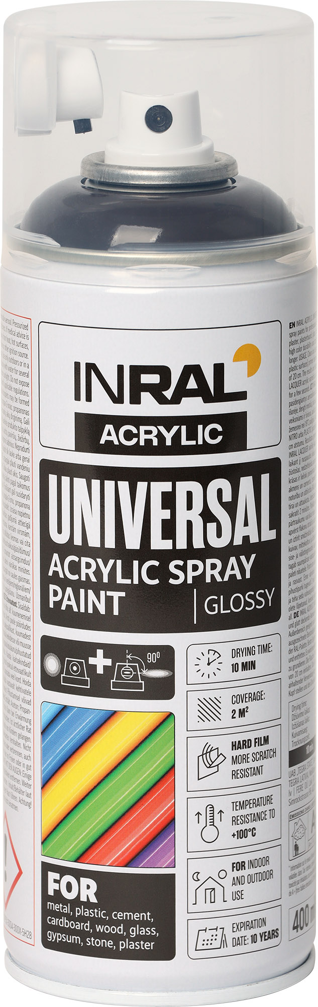 INRAL ACRYLIC UNIVERSAL – augstas kvalitātes, izturīgas, ātri žūstošas, nedzeltējošas izsmidzināmās krāsas, garantē gludu virsmas pārklājumu, paredzētas profesionālai un sadzīves lietošanai. Šīs krāsas ir lieliski piemērotas lietošanai iekšdarbiem un ārdarbiem, lai uzklātu uz metāla, plastmasas, apmetuma, ģipša, stikla, akmens un cementa. Izsmidzināmās krāsas nodrošina izcilu izturību pret atmosfēras iedarbību un gaismu, augstu pārklājuma noturību un atbilstību RAL paletei.